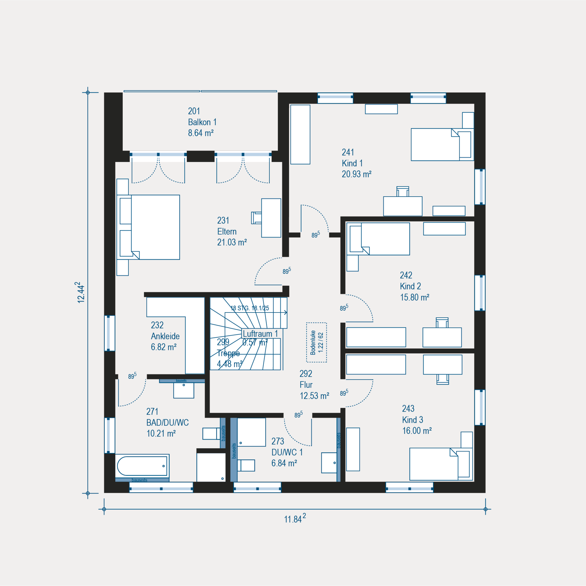 In unserer Stadtvilla City Villa 4 V4 findet auf knapp 248 m², verteilt auf 6 Zimmer, die ganze Familie Platz. Und auch an Gäste ist hier mit einem eigenen Zimmer gedacht.