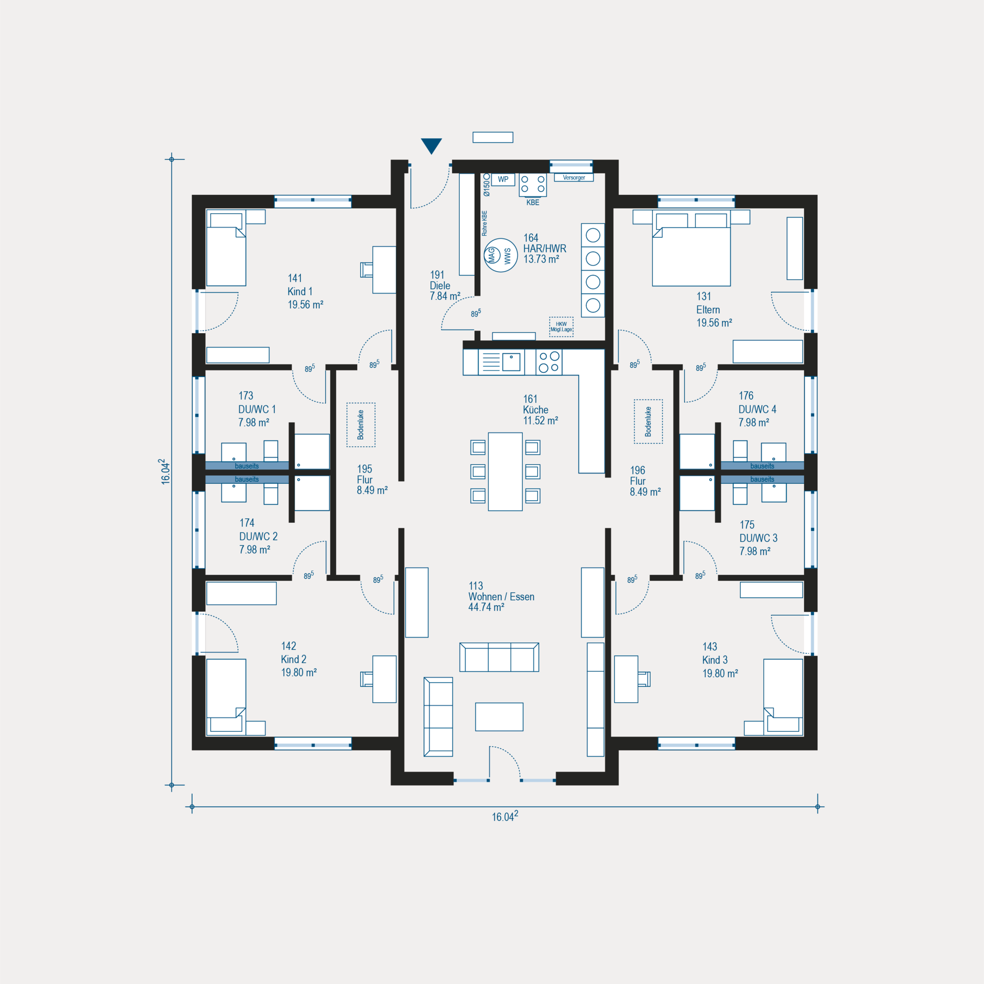 Ein heller, offener Wohn-Ess-Koch-Bereich, ein großzügiger Hauswirtschaftsraum sowie vier Schlafzimmer mit jeweils angeschlossenem Bad – der Bungalow Connect 1 vereint modernes Wohnen auf einer Ebene. Mit seinem Konzept eignet sich das Objekt für vielfache Nutzungskonzepte, beispielsweise für das altersgerechte Wohnen in gemeinsamen Wohngemeinschaften, ohne dabei auf Komfort und Privatsphäre verzichten zu müssen. Neben seiner zeitlosen Architektur zeichnet sich der Bungalow zudem durch seine zukunftsweisende und effiziente Haustechnik aus, mit der sich auch langfristig Ressourcen schonen lassen.