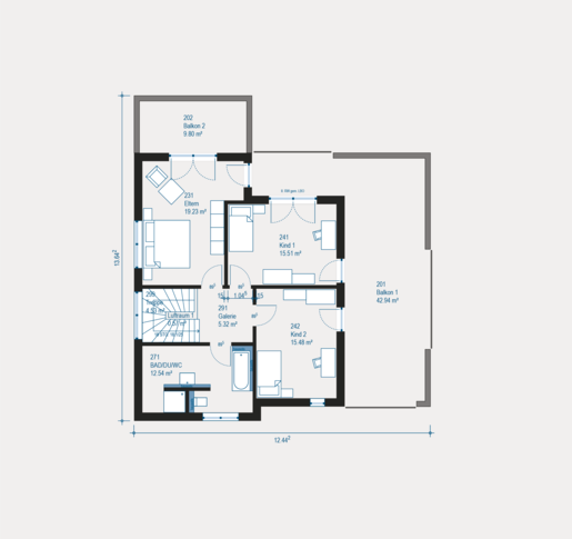 Das Obergeschoss mit 125,35 m² ist ein echtes Highlight: Zwei Kinderzimmer teilen sich einen großen Balkon, während das Elternschlafzimmer über einen eigenen Balkon verfügt. Hinzu kommt ein großzügiges Wellnessbad, das keine Wünsche offenlässt. Insgesamt stehen dir hier gleich zwei große Balkone zur Verfügung, auf denen du jederzeit frische Luft und Ausblicke genießen kannst.