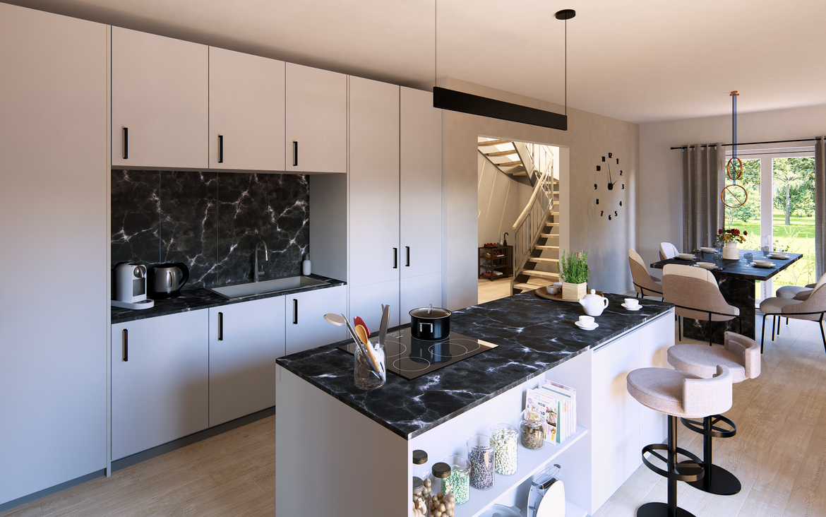 Das Fertighaus Highline 1 im Bauhaus-Stil vereint außergewöhnliche Architektur mit durchdachter Raumgestaltung. Im Erdgeschoss überzeugt der größe offene Wohn-, Ess- und Kochbereich. Ergänzt wird er durch eine praktisch abgegrenzte Speisekammer, ein Arbeitszimmer sowie ein Gäste-Bad – perfekt für flexible Nutzung.