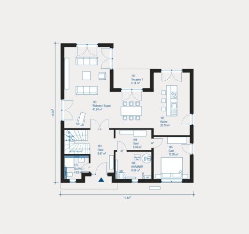 Im Highline 2 trifft moderne Architektur auf durchdachte Raumplanung. Der einladende Eingangsbereich mit abgetrennter Garderobe führt direkt in den offenen Wohn- und Essbereich. Ein zusätzliches Gäste- oder Arbeitszimmer im Erdgeschoss sowie zwei großzügige Balkone im Obergeschoss machen das Haus besonders vielseitig.