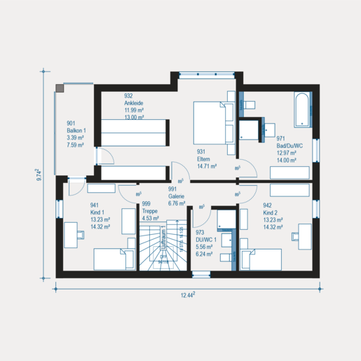 Unser Einfamilienhaus Highline 6 besticht ebenfalls durch ein üppiges Raumangebot. Wohn-/Essbereich und Küche umfassen hier ca. 56 m² und wirken durch die zahlreichen Fenstertüren sehr weitläufig. Im Obergeschoss befinden sich neben den drei Schlafzimmern, eines davon mit Ankleide und eigenem Badezimmer außerdem noch ein gemütlicher Balkon zum Entspannen.