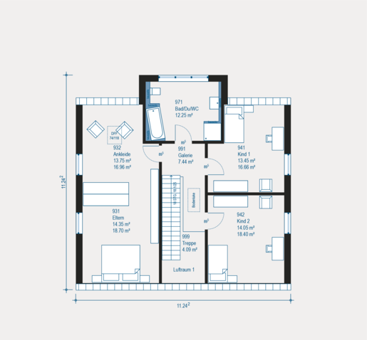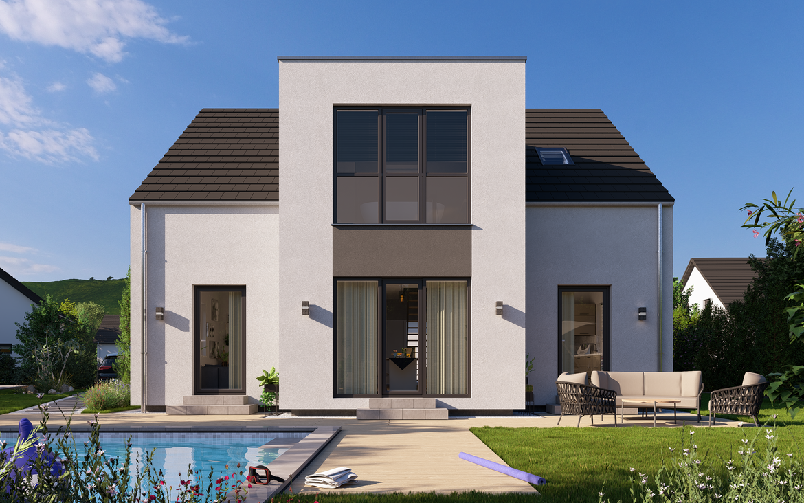Das Einfamilienhaus Highline 7 bietet dank der cleveren Raumaufteilung und satten 193,71 m² genügend Platz für jede Familie. Im Erdgeschoss findet man neben einem großen Wohn- und Essbereich auch noch eine Garderobe für Gäste und Familie. Hervor sticht ganz klar das in einem Erker liegende Badezimmer. Der Elternbereich ist großzügig mit eigenem Ankleidebereich gestaltet und mit zwei Kinderzimmern ist auch genug Platz für Nachwuchs. Überzeuge dich selbst von unserem cleveren Hausmodell!