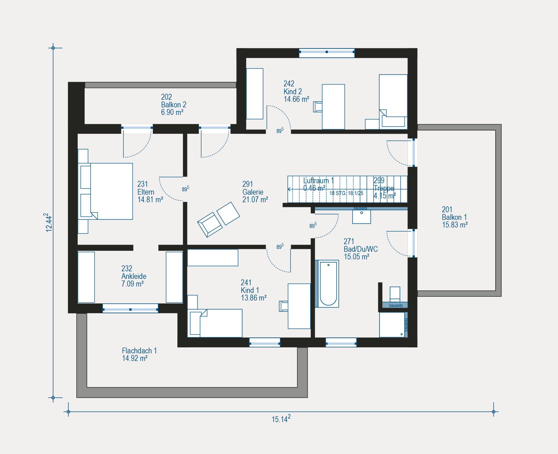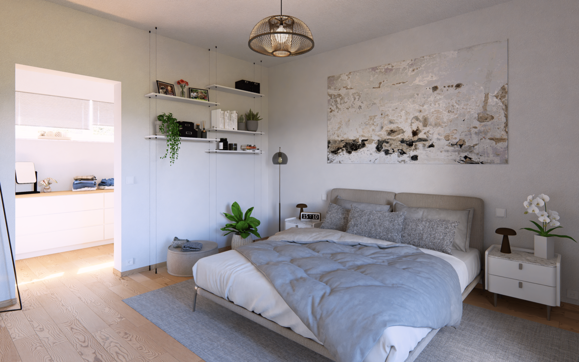 Im Obergeschoss wird es besonders großzügig: neben einer großzügigen Galerie findest du hier zwei Kinderzimmer. Außerdem befindet sich auf dieser Etage das Elternschlafzimmer mit eigener Ankleide und das große Wellnessbad. Insgesamt stehen dir zwei Balkone zur Verfügung – perfekt für entspannte Momente an der frischen Luft.