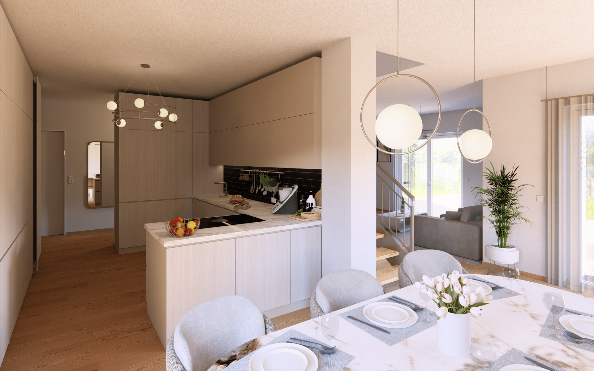 Das Highline 9 im Bauhaus-Stil kombiniert markante Architektur mit einer intelligent geplanten Raumaufteilung. Im Erdgeschoss erwartet dich ein weitläufiger Wohn-, Ess- und Kochbereich, ergänzt durch eine abgetrennte Speisekammer, ein Arbeitszimmer und ein Gäste-Bad – ideal für vielfältige Lebenssituationen.