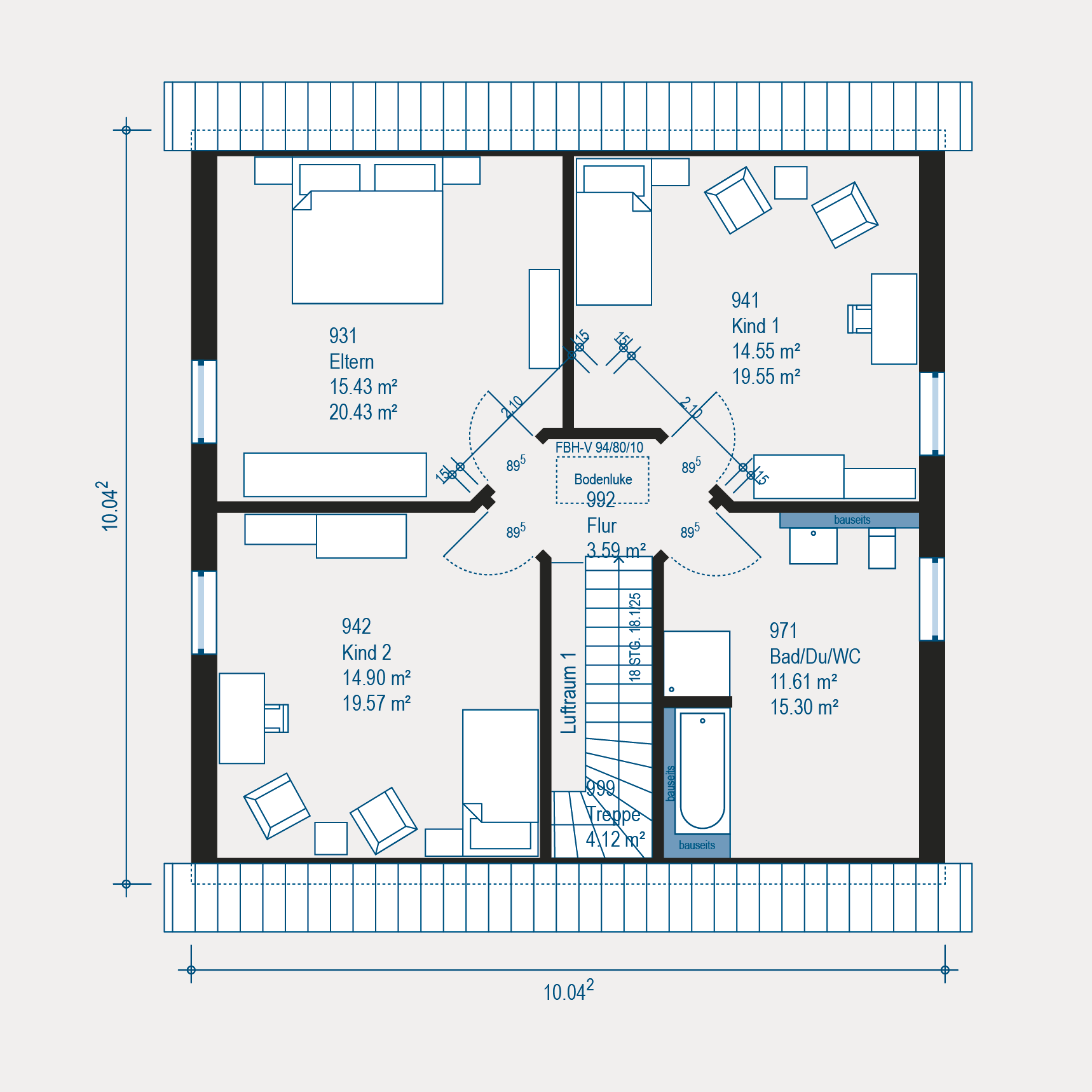 Hier kannst du deine individuellen Wohnträume verwirklichen und dir steht ein zusätzlicher Raum im Erdgeschoss zur Verfügung. Die angegebenen Maße beziehen sich auf die Variante mit 1,5-geschossigem Satteldach.